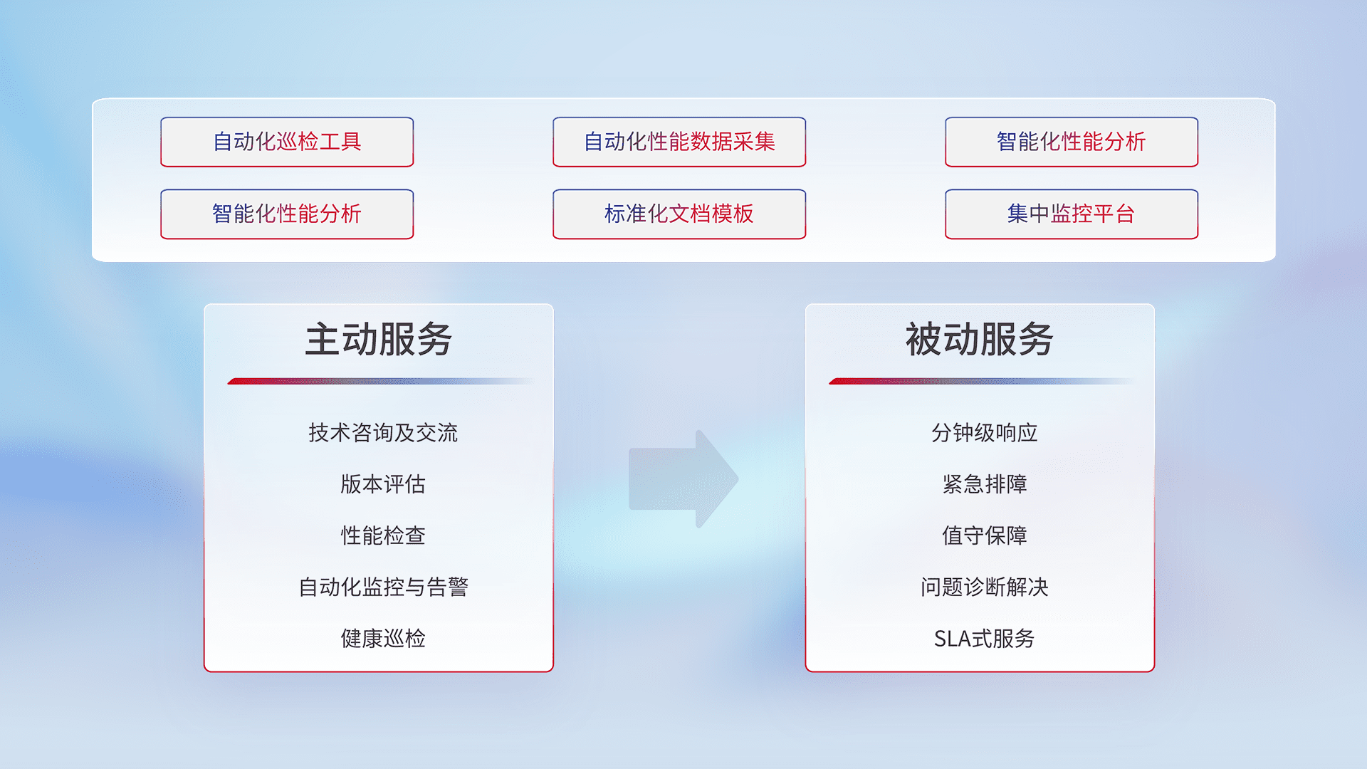 智能化工具和标准化文档,,保障服务质量,,,提供主动服务(包含技术咨询、、版本评估、、、性能检查、、、、自动化监控与告警、、健康巡检)和被动服务包含(分钟级响应、、、紧急排障、、、值守保障、、问题诊断解决、、SLA服务)。。。